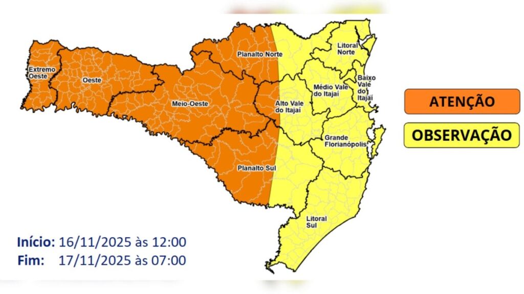 • Estão em alerta laranja: partes do Oeste, da Serra, do Vale do Itajaí e do Planalto Norte.