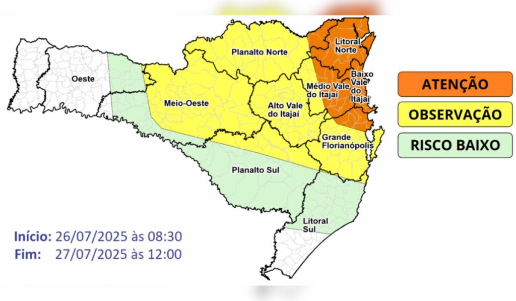 O alerta laranja (risco alto) foi emitido para o Litoral Norte, Baixo e Médio Vale do Itajaí e parte da Grande Florianópolis. Nessas áreas, a chance de alagamentos e enxurradas pontuais é maior, assim como a possibilidade de deslizamentos.