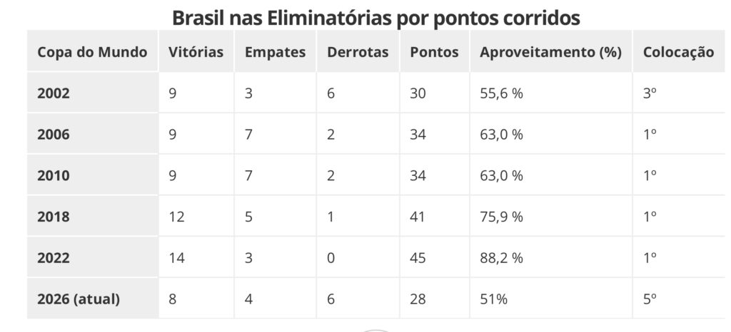 Desde 1996, o Brasil sempre se destacou nas Eliminatórias, liderando em 2006, 2010 e 2018. Em 2022, terminou em primeiro lugar invicto, somando 45 pontos — um contraste gritante com os atuais 28.