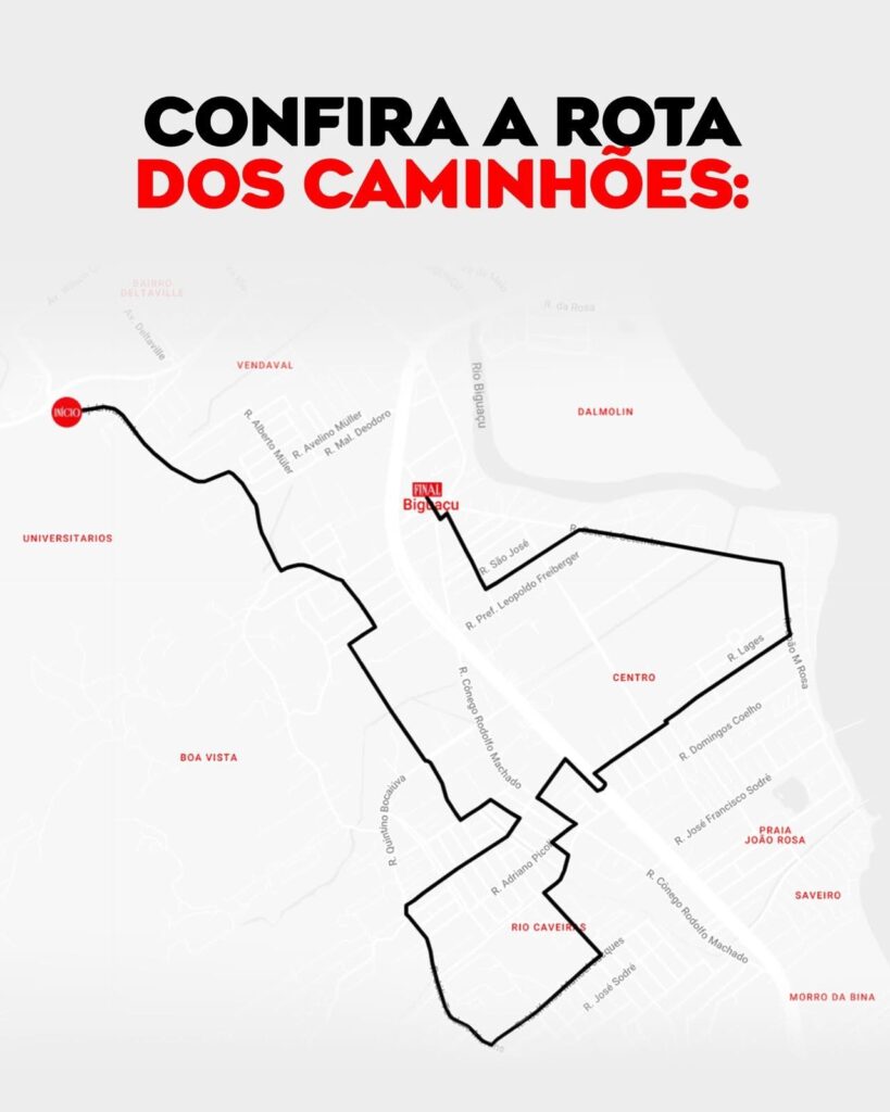 De acordo com a programação divulgada, os caminhões da caravana partem da Rua Major Livramento e seguem em direção à Praça Nereu Ramos, um dos pontos mais tradicionais e movimentados da cidade.
