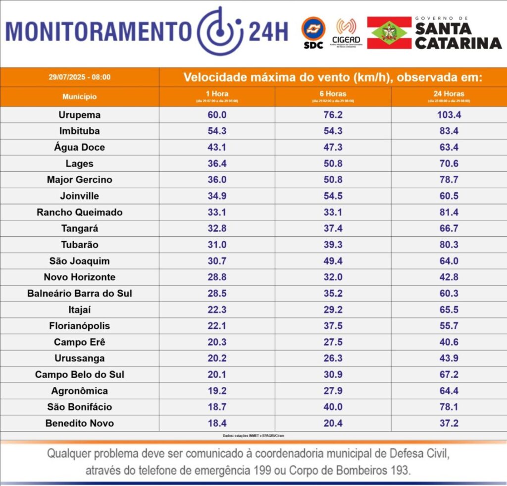 Além da maré alta, o ciclone provocou rajadas de vento que chegaram a 103 km/h em Urupema, na Serra Catarinense — a maior velocidade registrada no Estado nas últimas 24 horas, segundo a Defesa Civil.