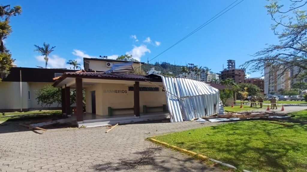Em Florianópolis, os ventos arrancaram parte do telhado da estrutura da Polícia Militar no bairro Trindade. Ninguém ficou ferido.