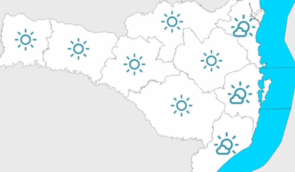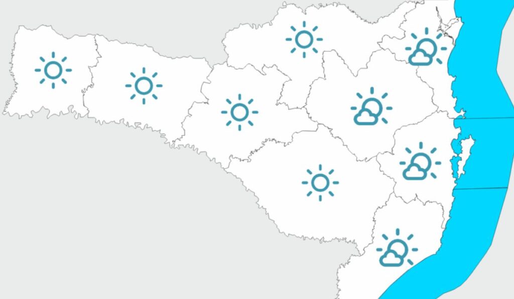 • Máximas: acima de 20°C em todo o estado, chegando a 30°C no Oeste, Vale do Itajaí, Grande Florianópolis, Planalto e Litoral Norte.