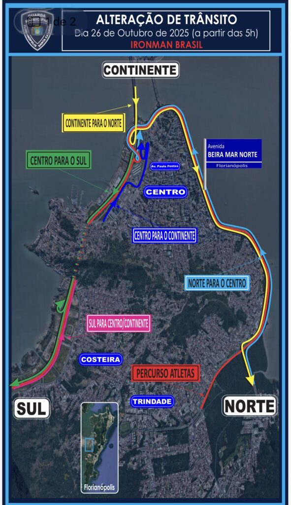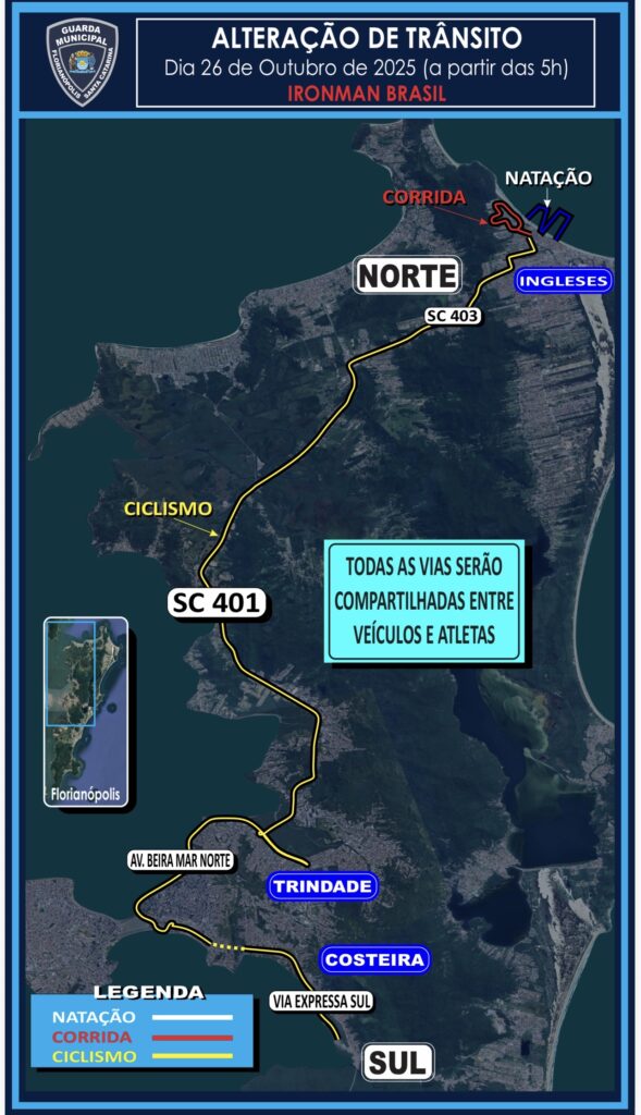 Para o IRONMAN 70.3, a PMSC vai orientar o trânsito nos trechos do norte da ilha. A Guarda Municipal de Florianópolis será encarregada em orientar o percurso a partir do TITRI até a Via Expressa Sul.