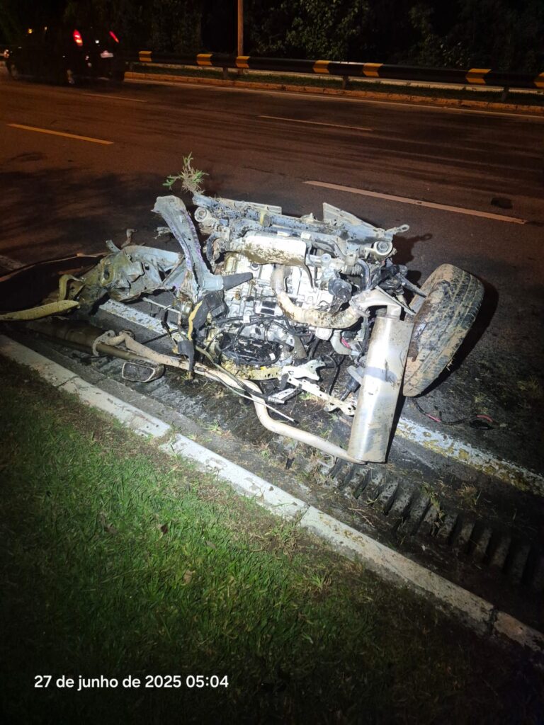 De acordo com informações da Guarda Municipal, o motorista perdeu o controle da direção, bateu em um poste — que chegou a ser arrancado do chão com o impacto — e colidiu em seguida contra uma árvore. A força da batida foi tão intensa que a parte dianteira do veículo se separou do restante, lançando componentes como motor, caixa de transmissão e suspensão a vários metros de distância.