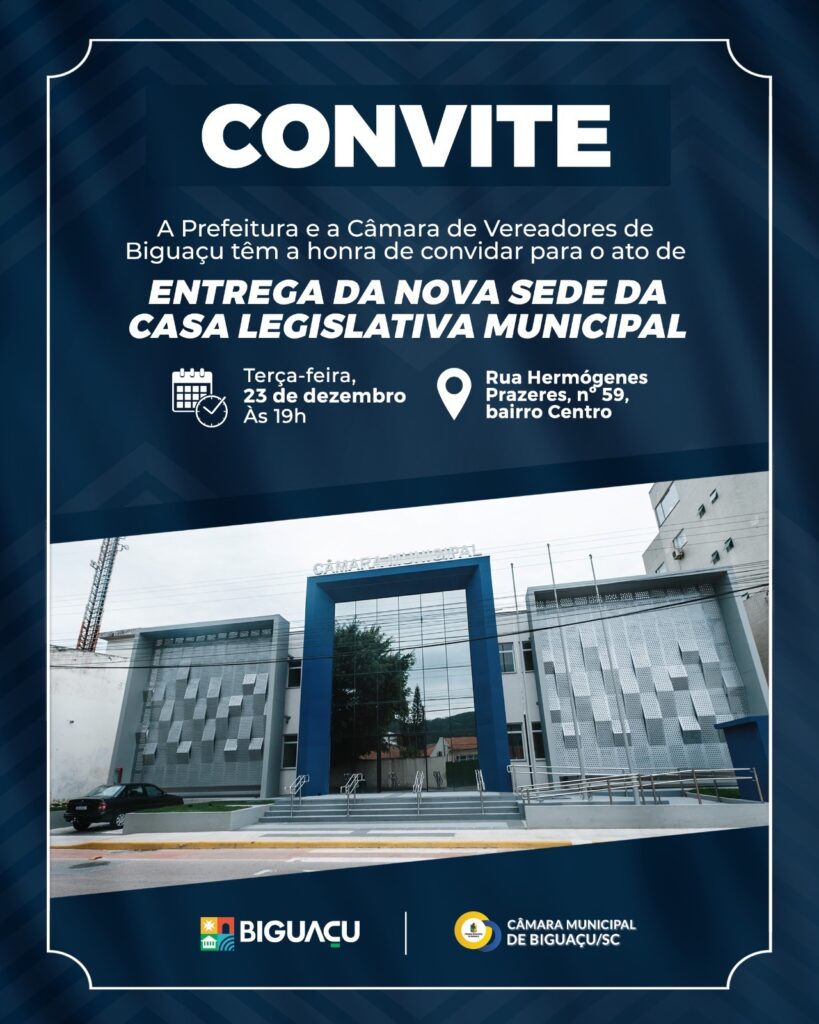 A Prefeitura de Biguaçu e a Câmara de Vereadores convidam a população para o ato de entrega da obra da nova sede da Casa Legislativa Municipal, um momento importante para o fortalecimento da atividade legislativa e da transparência no município.