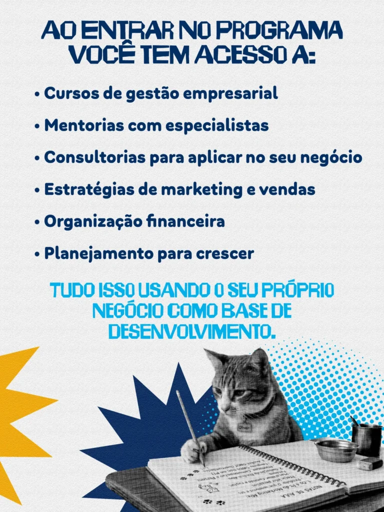 A proposta é semelhante a um “MBA para micro negócios”. Nesse sentido, o participante utiliza a própria empresa como objeto de estudo durante as aulas. Isso garante que cada ferramenta apresentada seja aplicada em tempo real. Como resultado, o empreendedor percebe melhorias imediatas tanto no faturamento quanto na organização interna.