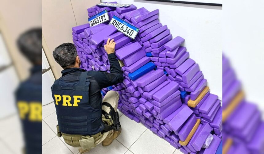 Ao abordarem o automóvel com placas suspeitas, os policiais constataram que o motorista não possuía habilitação e que o veículo apresentava sinais de adulteração. No porta-malas e bancos traseiros, os agentes encontraram fardos de maconha, totalizando quase 600 quilos da droga.
