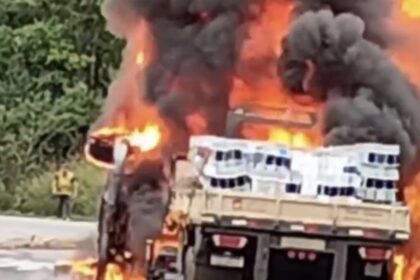 Acidente entre caminhão e carro causa incêndio e interdita totalmente rodovia na…