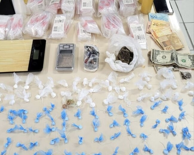No local, os policiais apreenderam aproximadamente 250 porções de cocaína prontas para a venda, cerca de 250 gramas de haxixe, embalagens plásticas para acondicionamento das drogas, duas balanças de precisão, além de dinheiro em espécie (moeda nacional e estrangeira) e dois celulares.