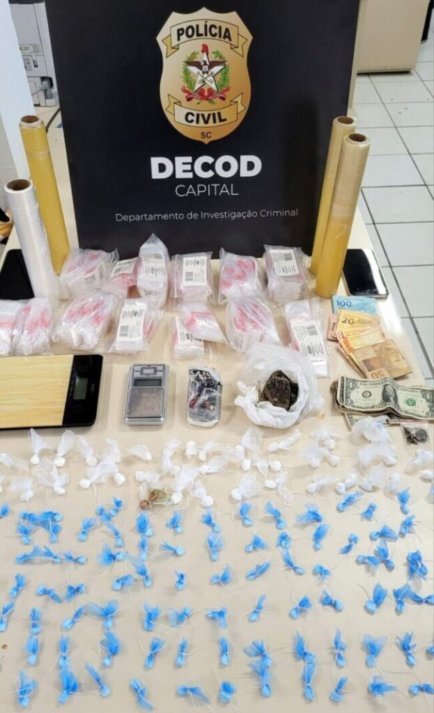 A ação ocorreu no bairro Itacorubi, onde os agentes cumpriram mandado de busca e apreensão em uma residência usada como base para o tráfico. O indivíduo foi surpreendido com uma grande quantidade de drogas e materiais relacionados à comercialização ilegal.